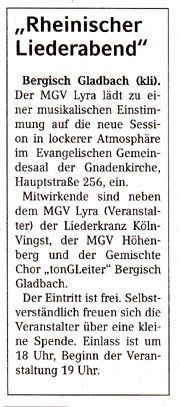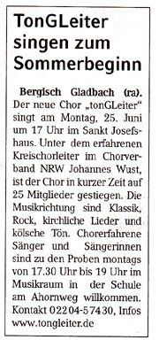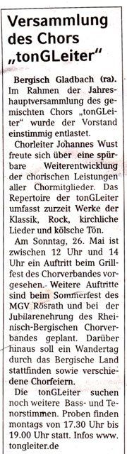 Der gemischte Chor „tonGLeiter“ möchte sich vergrößern und sucht Tenor – und Bass Stimmen. Kontakte an: Elisabeth Schmitz-Pamp, Tel. 02204 69781.Oder: schmitz-pamp@netcologne.de